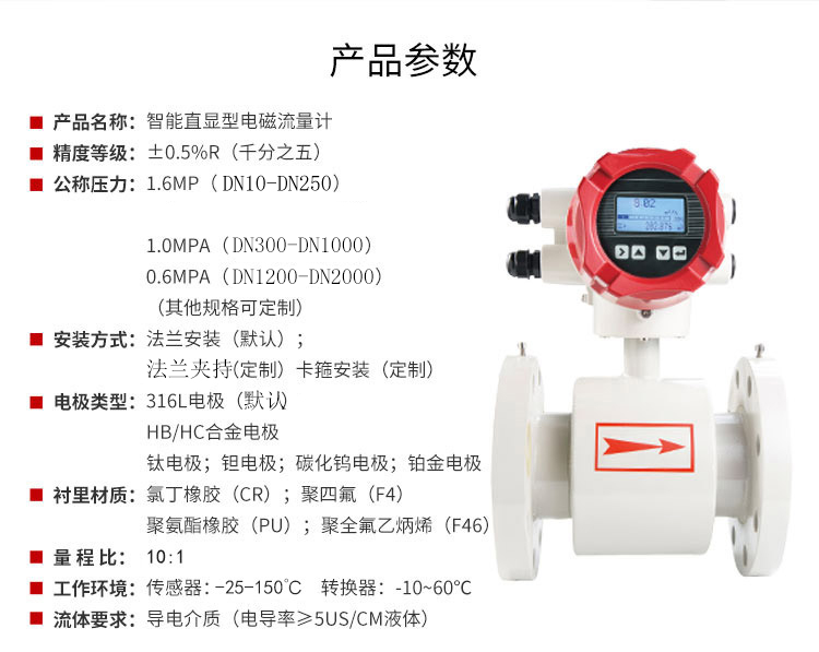 LDG-MIK升級款電磁流量計是根據法拉第電磁感應定律進行流量測試的流量計。電磁流量計的優點是壓損極小,可測流量范圍大。最大流量與最小流量的比值一般為10:1以上,適用的工業管徑范圍寬,最大可達3m,輸出信號和被測流量呈線性,精確度較高,可測量電導率≥50μs/cm的酸、堿鹽溶液、水、污水、腐蝕性液體以及泥漿、礦漿、紙漿等流體流量。