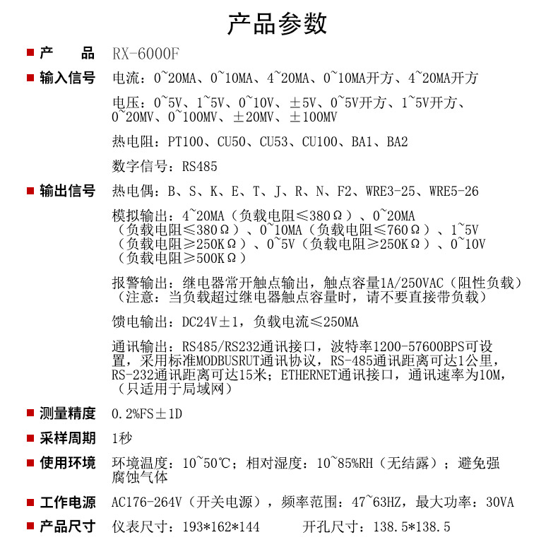 RX-6000F系列無紙記錄儀集各種工業場合中數據的測量、顯示、處理、運算、報警、記錄等多種功能為一體,具有36路模擬量信號輸入通道,8路繼電器報警輸出,150mA配電輸出(可接6路兩線制變送器,或者2路四線制變器),2路RS-485通訊接口,并擁有1個USB數據轉存接口。