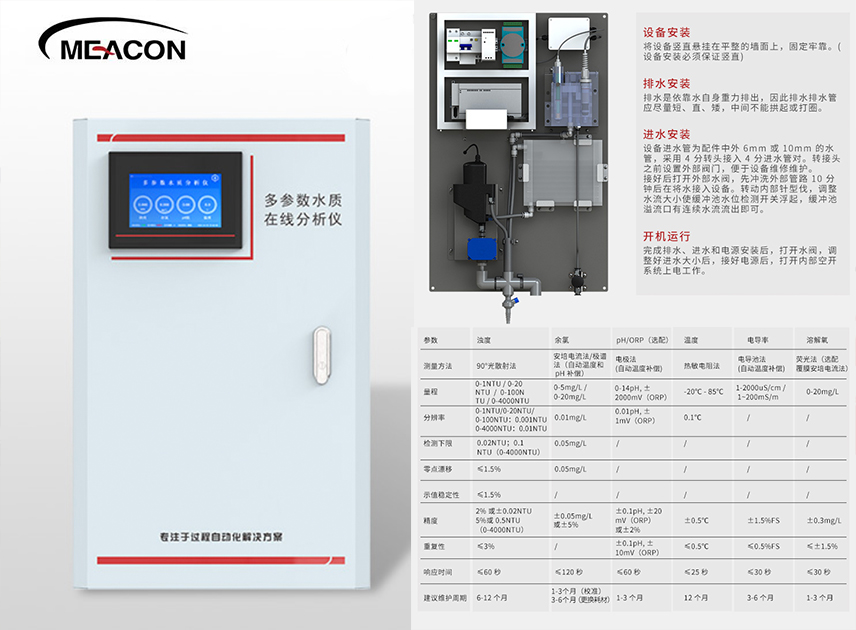 MPP100系列多參數在線監測儀是美儀為滿足客戶多種現場要求而推出新一代水質檢測設備。MPP100采用了一體化設計風格,集成多個水質參數測量功能,憑借“高可靠、低維護”的特點,目前已被廣泛應用于自來水廠、自來水輸水管網、大型凈水設備以及直飲水項目等多種水質監測場合。