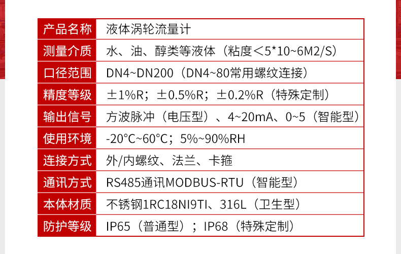 美控渦輪流量計是一種速度式儀表,它具有精度高,重復性好、結構簡單、耐高壓、測量范圍寬、體積小、重量輕、壓力損失小、壽命長、操作簡單、維修方便等優點,用于封閉管道中測量低粘度、無強腐蝕性、清潔液體的體積流量和累積流量。