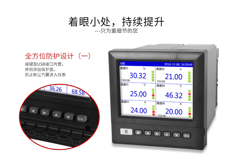 彩屏,6通道萬能信號輸入,3路報警輸出,RS232通訊,配電,流量累積,USB接口,AC220V供電