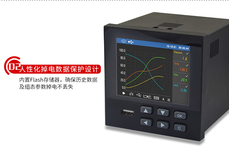 掉電保護:所有數據保存在FLASH存儲器中,無需后備電池,確保所有歷史數據及組態參數不會因掉電而丟失
