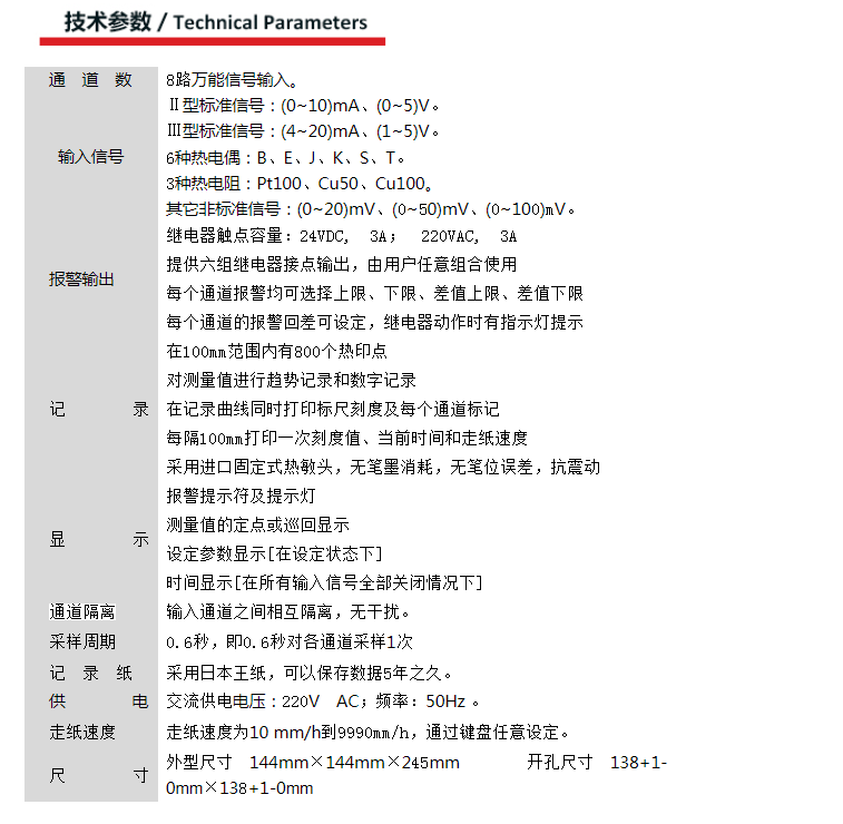 MIK-R1000滅菌記錄儀以先進(jìn)的熱打印記錄方式和先進(jìn)的微處理控制技術(shù),具有高清晰度,高精度,高可靠性等特點(diǎn),是新一代多功能有紙記錄儀。它第一個(gè)通道接收熱電阻Pt100信號(hào),其余通道能接收溫度、溫濕度、電流、電壓、壓力、流量、液位等現(xiàn)場(chǎng)其他信號(hào),并可對(duì)被測(cè)信號(hào)進(jìn)行數(shù)字顯示及進(jìn)行趨勢(shì)記錄和數(shù)字記錄,能在本身打印的120mm寬的紙格上同時(shí)記錄刻度值、時(shí)間及每一個(gè)信號(hào)的曲線,并將通道號(hào)印在各通道的軌跡旁。打印記錄功能采用進(jìn)口固定式熱敏頭,無筆墨消耗,無筆位誤差,抗震動(dòng),打印的數(shù)據(jù)可以保存3年以上。目前廣泛應(yīng)用于冶金、醫(yī)藥、石油、化工、電力等行業(yè)及科研單位。
